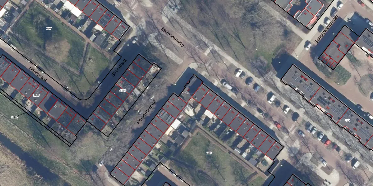 Het perceel waarop Perseusstraat 12 staat heeft een oppervlakte van 3603 m². Dit is een zeer groot perceel. De perceeloppervlakte wordt geregistreerd door het Kadaster. Gedetailleerde informatie over de maten van dit perceel kunt u vinden in het rapport Kadastrale kaart met maatvoering van Perseusstraat 12.