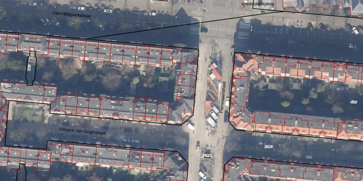 Het perceel waarop Pienemanstraat 26 staat heeft een oppervlakte van 1,2 ha. Dit is een zeer groot perceel. De perceeloppervlakte wordt geregistreerd door het Kadaster. Gedetailleerde informatie over de maten van dit perceel kunt u vinden in het rapport Kadastrale kaart met maatvoering van Pienemanstraat 26.