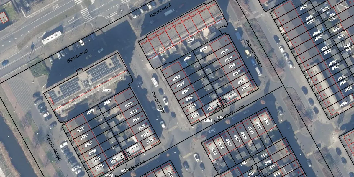 Gebruik de zoekbalk of klik op een perceel voor informatie over de adressen binnen dit perceel.