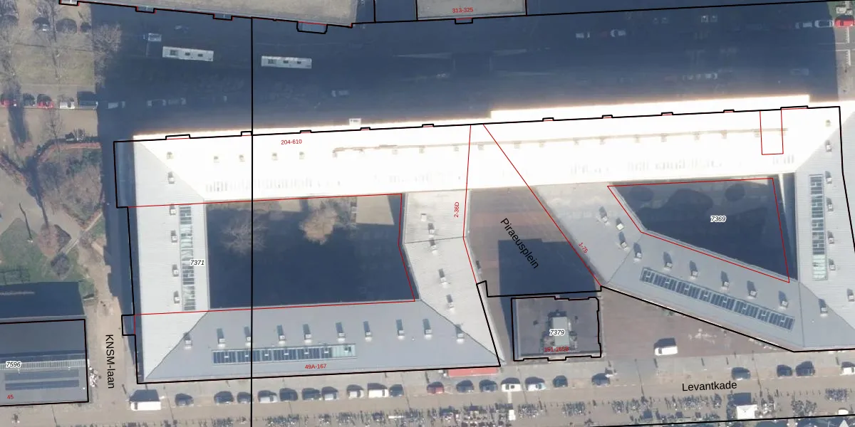 Het perceel waarop Piraeusplein 12 staat heeft een oppervlakte van 7168 m². Dit is een zeer groot perceel. De perceeloppervlakte wordt geregistreerd door het Kadaster. Gedetailleerde informatie over de maten van dit perceel kunt u vinden in het rapport Kadastrale kaart met maatvoering van Piraeusplein 12.