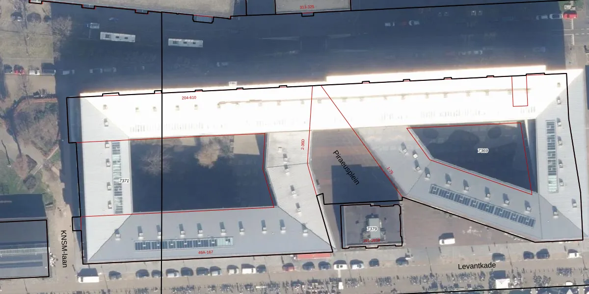 Het perceel waarop Piraeusplein 14 staat heeft een oppervlakte van 7168 m². Dit is een zeer groot perceel. De perceeloppervlakte wordt geregistreerd door het Kadaster. Gedetailleerde informatie over de maten van dit perceel kunt u vinden in het rapport Kadastrale kaart met maatvoering van Piraeusplein 14.