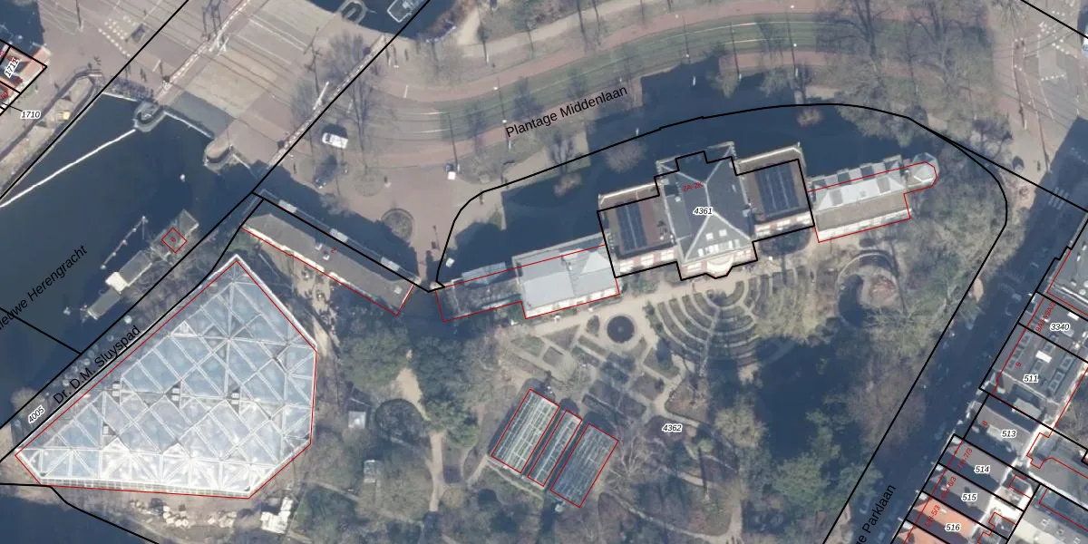 Het perceel waarop Plantage Middenlaan 2-A staat heeft een oppervlakte van 1,2 ha. Dit is een zeer groot perceel. De perceeloppervlakte wordt geregistreerd door het Kadaster. Gedetailleerde informatie over de maten van dit perceel kunt u vinden in het rapport Kadastrale kaart met maatvoering van Plantage Middenlaan 2-A.