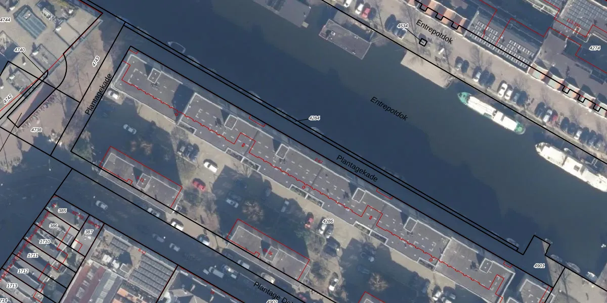 Het perceel waarop Plantagekade 34 staat heeft een oppervlakte van 6402 m². Dit is een zeer groot perceel. De perceeloppervlakte wordt geregistreerd door het Kadaster. Gedetailleerde informatie over de maten van dit perceel kunt u vinden in het rapport Kadastrale kaart met maatvoering van Plantagekade 34.