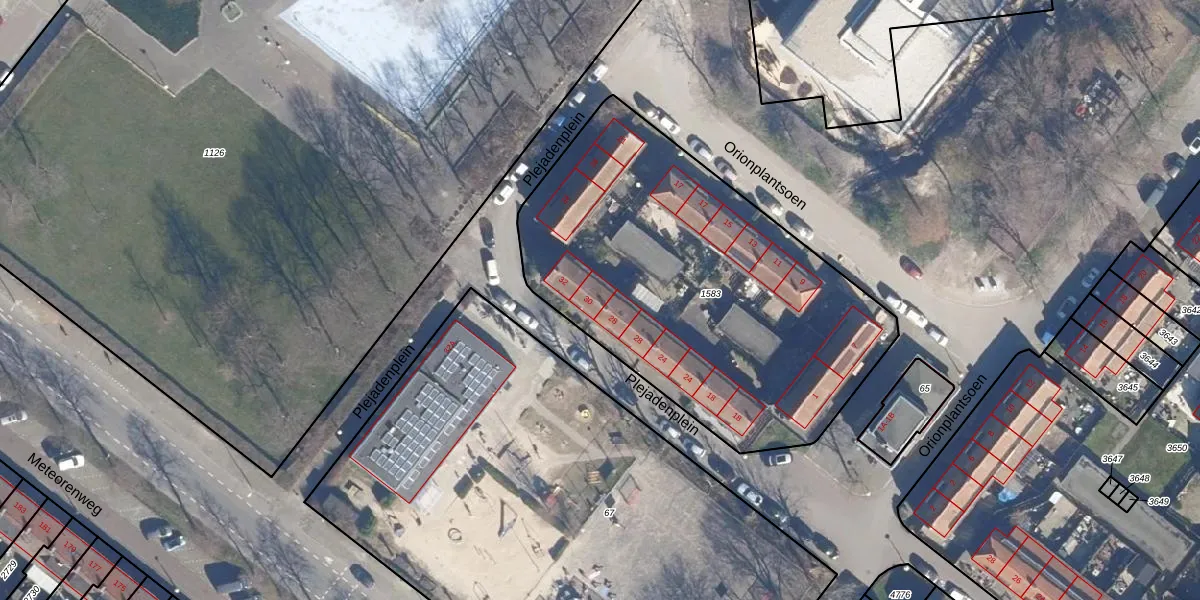 Het perceel waarop Plejadenplein 30 staat heeft een oppervlakte van 2066 m². Dit is een zeer groot perceel. De perceeloppervlakte wordt geregistreerd door het Kadaster. Gedetailleerde informatie over de maten van dit perceel kunt u vinden in het rapport Kadastrale kaart met maatvoering van Plejadenplein 30.