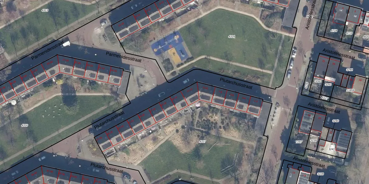 Het perceel waarop Plutarchusstraat 12 staat heeft een oppervlakte van 3942 m². Dit is een zeer groot perceel. De perceeloppervlakte wordt geregistreerd door het Kadaster. Gedetailleerde informatie over de maten van dit perceel kunt u vinden in het rapport Kadastrale kaart met maatvoering van Plutarchusstraat 12.