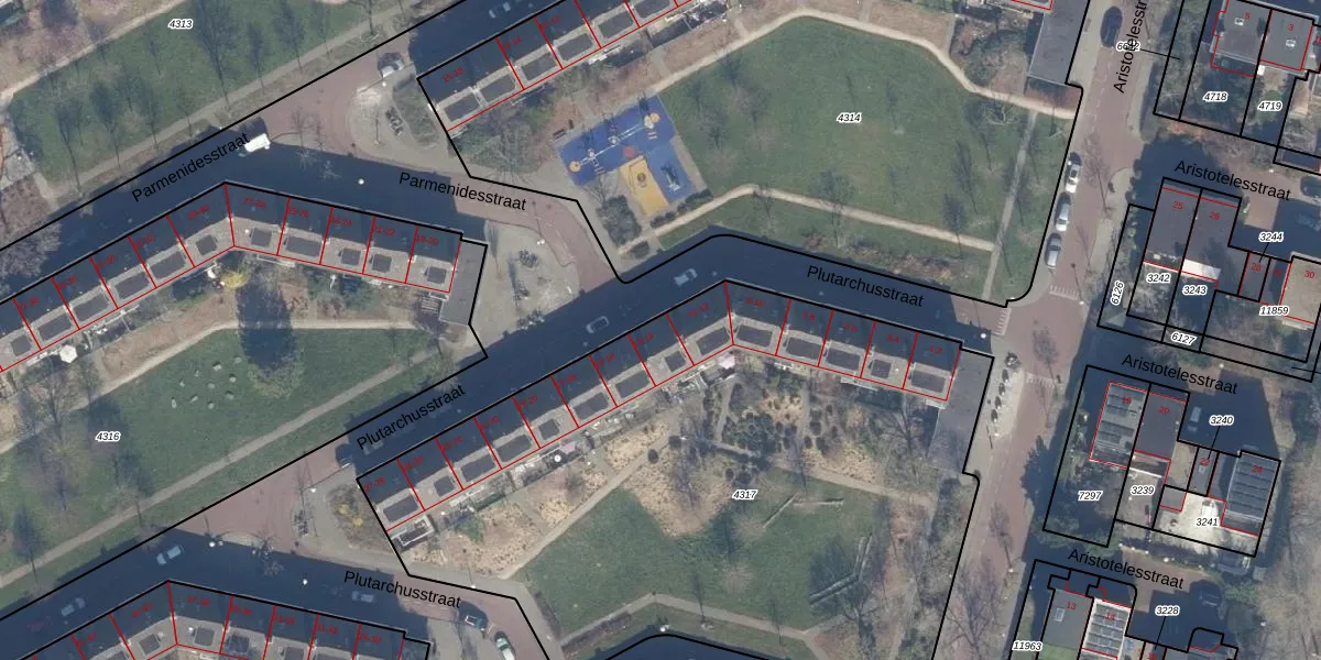 Het perceel waarop Plutarchusstraat 13 staat heeft een oppervlakte van 3942 m². Dit is een zeer groot perceel. De perceeloppervlakte wordt geregistreerd door het Kadaster. Gedetailleerde informatie over de maten van dit perceel kunt u vinden in het rapport Kadastrale kaart met maatvoering van Plutarchusstraat 13.