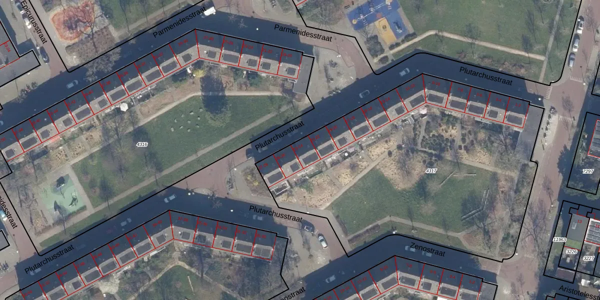 Het perceel waarop Plutarchusstraat 24 staat heeft een oppervlakte van 3942 m². Dit is een zeer groot perceel. De perceeloppervlakte wordt geregistreerd door het Kadaster. Gedetailleerde informatie over de maten van dit perceel kunt u vinden in het rapport Kadastrale kaart met maatvoering van Plutarchusstraat 24.