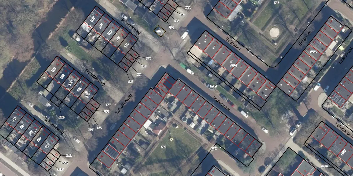 Het perceel waarop Plutostraat 12 staat heeft een oppervlakte van 3715 m². Dit is een zeer groot perceel. De perceeloppervlakte wordt geregistreerd door het Kadaster. Gedetailleerde informatie over de maten van dit perceel kunt u vinden in het rapport Kadastrale kaart met maatvoering van Plutostraat 12.