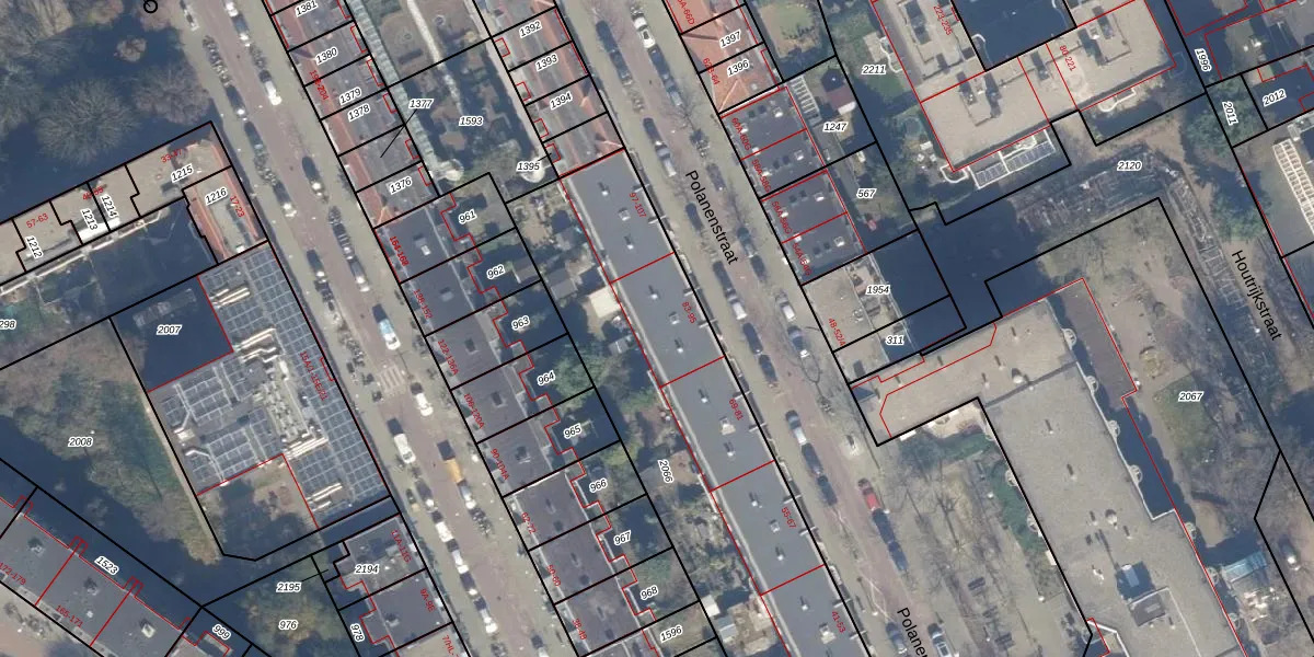Het perceel waarop Polanenstraat 95 staat heeft een oppervlakte van 2353 m². Dit is een zeer groot perceel. De perceeloppervlakte wordt geregistreerd door het Kadaster. Gedetailleerde informatie over de maten van dit perceel kunt u vinden in het rapport Kadastrale kaart met maatvoering van Polanenstraat 95.