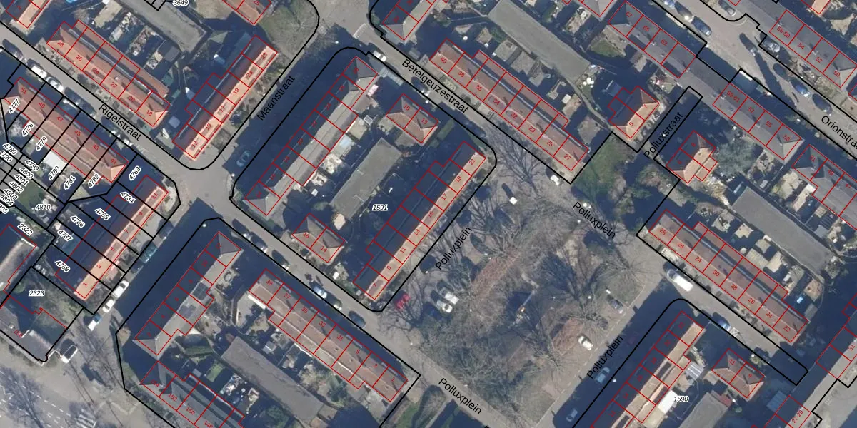 Het perceel waarop Polluxplein 15 staat heeft een oppervlakte van 2141 m². Dit is een zeer groot perceel. De perceeloppervlakte wordt geregistreerd door het Kadaster. Gedetailleerde informatie over de maten van dit perceel kunt u vinden in het rapport Kadastrale kaart met maatvoering van Polluxplein 15.
