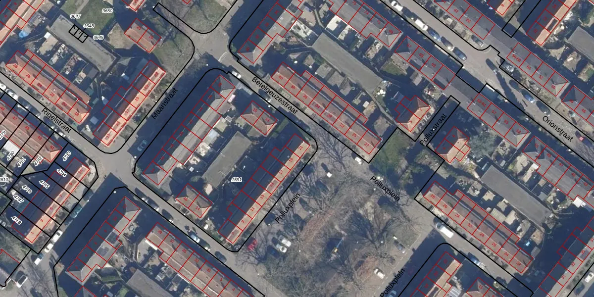 Het perceel waarop Polluxplein 21 staat heeft een oppervlakte van 2141 m². Dit is een zeer groot perceel. De perceeloppervlakte wordt geregistreerd door het Kadaster. Gedetailleerde informatie over de maten van dit perceel kunt u vinden in het rapport Kadastrale kaart met maatvoering van Polluxplein 21.