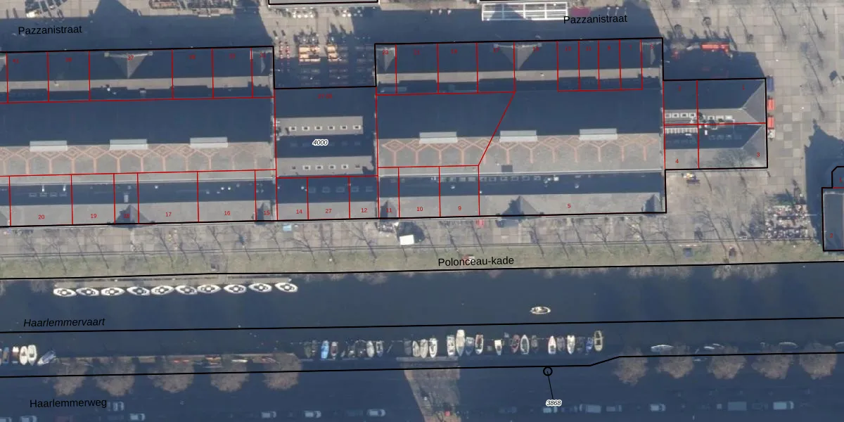 Het perceel waarop Polonceau-kade 10 staat heeft een oppervlakte van 7389 m². Dit is een zeer groot perceel. De perceeloppervlakte wordt geregistreerd door het Kadaster. Gedetailleerde informatie over de maten van dit perceel kunt u vinden in het rapport Kadastrale kaart met maatvoering van Polonceau-kade 10.