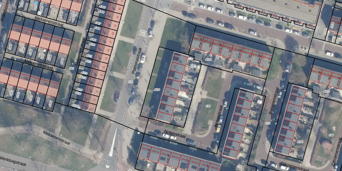 Het perceel waarop Pomonastraat 10 staat heeft een oppervlakte van 1096 m². Dit is een zeer groot perceel. De perceeloppervlakte wordt geregistreerd door het Kadaster. Gedetailleerde informatie over de maten van dit perceel kunt u vinden in het rapport Kadastrale kaart met maatvoering van Pomonastraat 10.