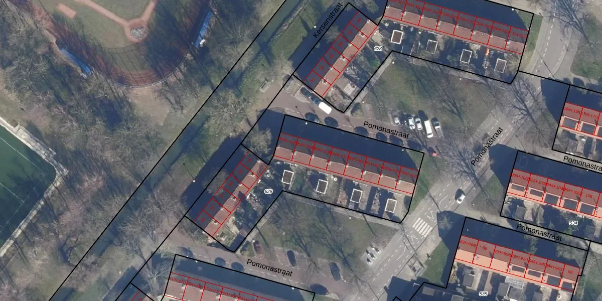 Het perceel waarop Pomonastraat 105-H staat heeft een oppervlakte van 1761 m². Dit is een zeer groot perceel. De perceeloppervlakte wordt geregistreerd door het Kadaster. Gedetailleerde informatie over de maten van dit perceel kunt u vinden in het rapport Kadastrale kaart met maatvoering van Pomonastraat 105-H.
