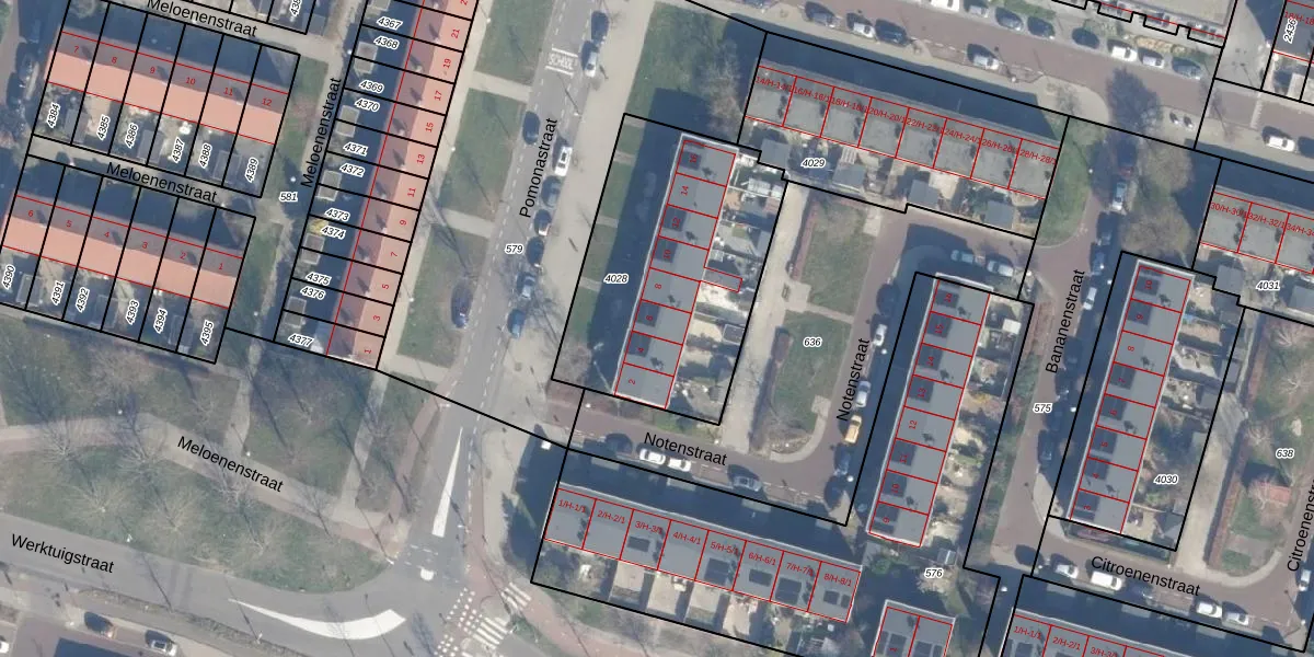 Het perceel waarop Pomonastraat 6 staat heeft een oppervlakte van 1096 m². Dit is een zeer groot perceel. De perceeloppervlakte wordt geregistreerd door het Kadaster. Gedetailleerde informatie over de maten van dit perceel kunt u vinden in het rapport Kadastrale kaart met maatvoering van Pomonastraat 6.