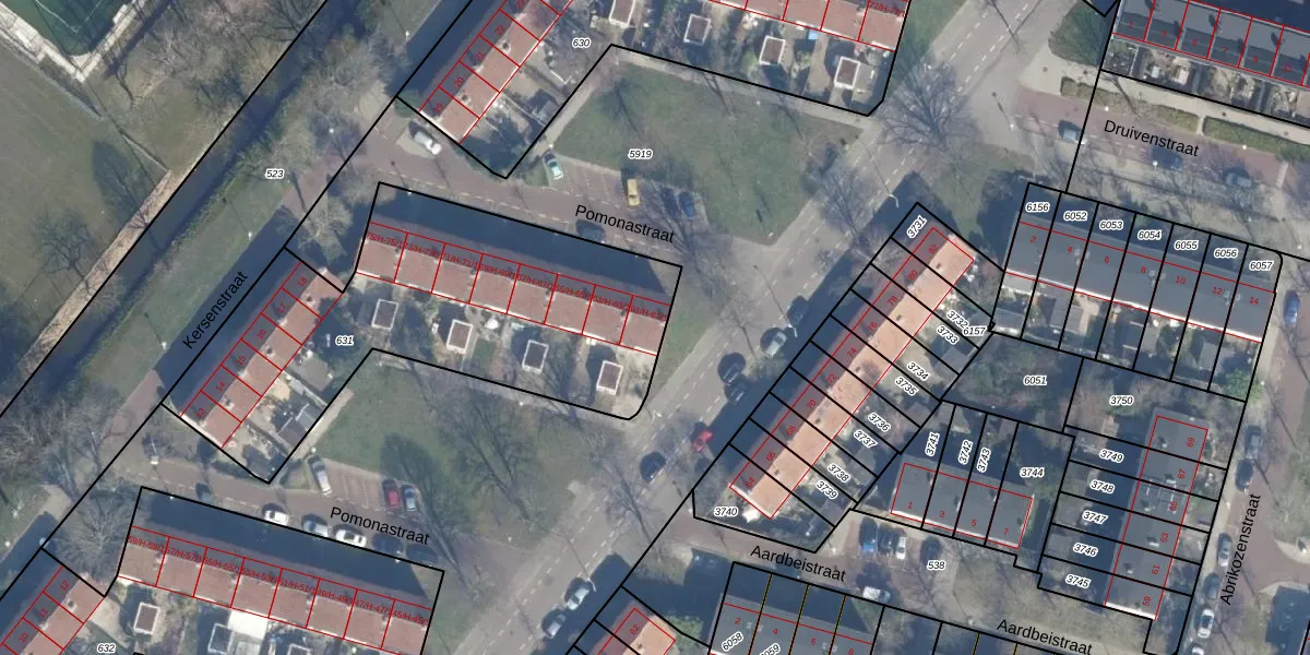 Het perceel waarop Pomonastraat 61-1 staat heeft een oppervlakte van 1767 m². Dit is een zeer groot perceel. De perceeloppervlakte wordt geregistreerd door het Kadaster. Gedetailleerde informatie over de maten van dit perceel kunt u vinden in het rapport Kadastrale kaart met maatvoering van Pomonastraat 61-1.