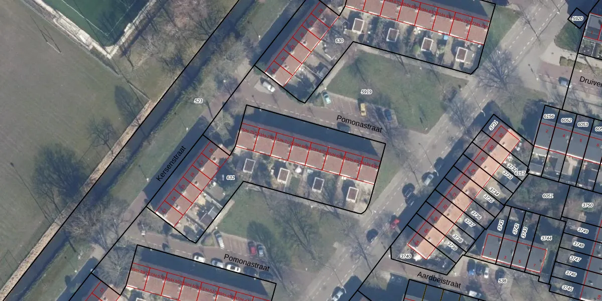 Het perceel waarop Pomonastraat 69-H staat heeft een oppervlakte van 1767 m². Dit is een zeer groot perceel. De perceeloppervlakte wordt geregistreerd door het Kadaster. Gedetailleerde informatie over de maten van dit perceel kunt u vinden in het rapport Kadastrale kaart met maatvoering van Pomonastraat 69-H.