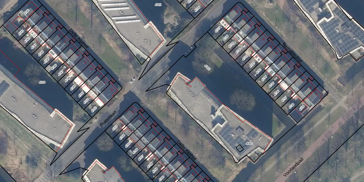 Het perceel waarop Praterlaan 100 staat heeft een oppervlakte van 2641 m². Dit is een zeer groot perceel. De perceeloppervlakte wordt geregistreerd door het Kadaster. Gedetailleerde informatie over de maten van dit perceel kunt u vinden in het rapport Kadastrale kaart met maatvoering van Praterlaan 100.