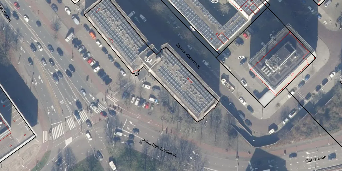 Het perceel waarop Prins Bernhardplein 105 staat heeft een oppervlakte van 1577 m². Dit is een zeer groot perceel. De perceeloppervlakte wordt geregistreerd door het Kadaster. Gedetailleerde informatie over de maten van dit perceel kunt u vinden in het rapport Kadastrale kaart met maatvoering van Prins Bernhardplein 105.