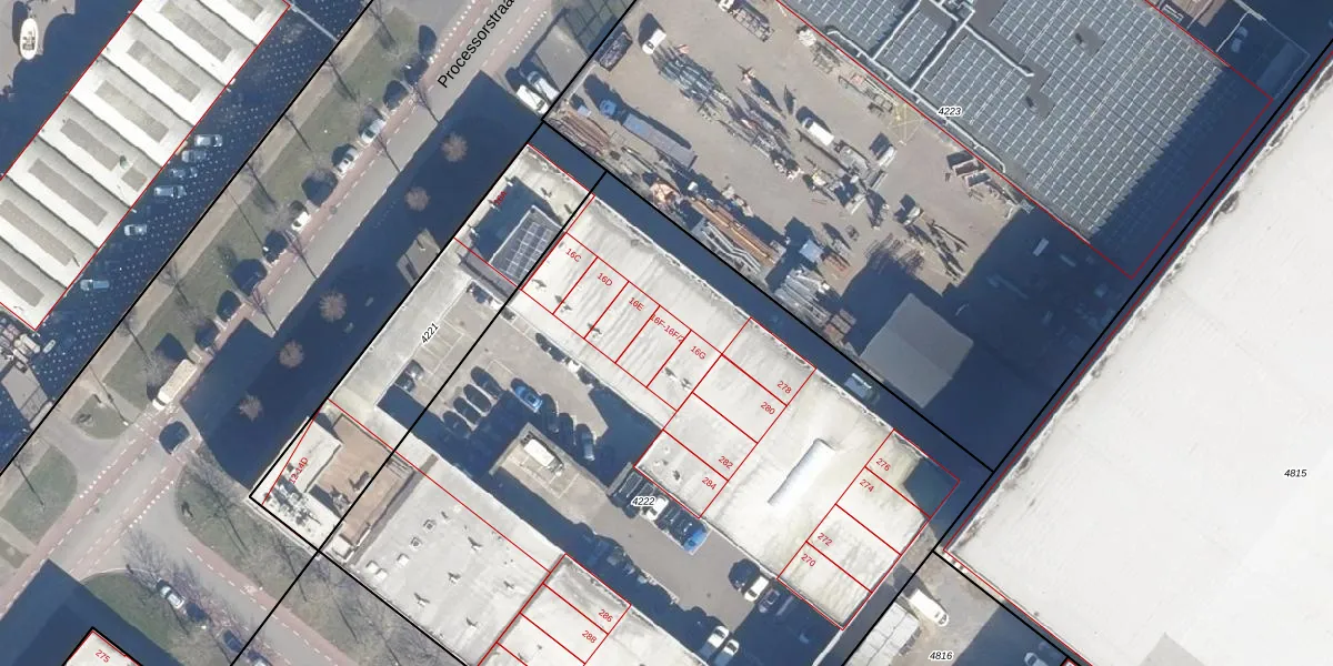 Het perceel waarop Processorstraat 16-F-2 staat heeft een oppervlakte van 5238 m². Dit is een zeer groot perceel. De perceeloppervlakte wordt geregistreerd door het Kadaster. Gedetailleerde informatie over de maten van dit perceel kunt u vinden in het rapport Kadastrale kaart met maatvoering van Processorstraat 16-F-2.