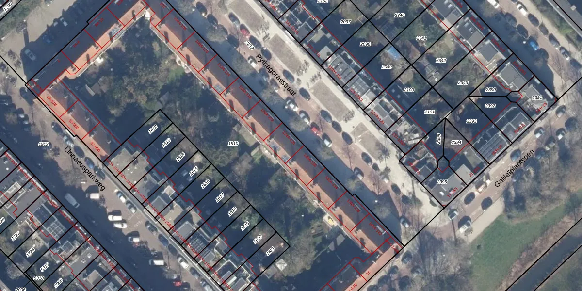 Het perceel waarop Pythagorasstraat 126 staat heeft een oppervlakte van 5397 m². Dit is een zeer groot perceel. De perceeloppervlakte wordt geregistreerd door het Kadaster. Gedetailleerde informatie over de maten van dit perceel kunt u vinden in het rapport Kadastrale kaart met maatvoering van Pythagorasstraat 126.
