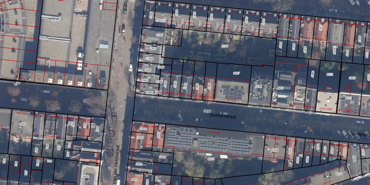Het perceel waarop Quellijnstraat 107-B staat heeft een oppervlakte van 126 m². Dit is een middelgroot perceel. De perceeloppervlakte wordt geregistreerd door het Kadaster. Gedetailleerde informatie over de maten van dit perceel kunt u vinden in het rapport Kadastrale kaart met maatvoering van Quellijnstraat 107-B.