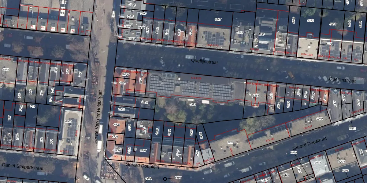 Het perceel waarop Quellijnstraat 122-G staat heeft een oppervlakte van 1315 m². Dit is een zeer groot perceel. De perceeloppervlakte wordt geregistreerd door het Kadaster. Gedetailleerde informatie over de maten van dit perceel kunt u vinden in het rapport Kadastrale kaart met maatvoering van Quellijnstraat 122-G.