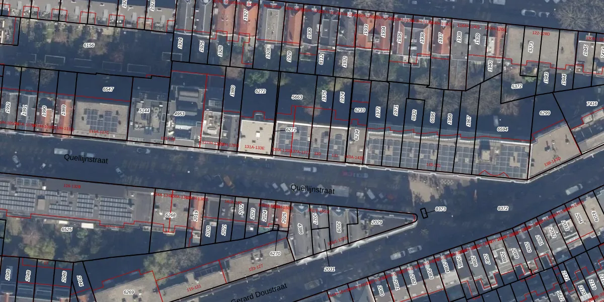 Het perceel waarop Quellijnstraat 137-F staat heeft een oppervlakte van 331 m². Dit is een groot perceel. De perceeloppervlakte wordt geregistreerd door het Kadaster. Gedetailleerde informatie over de maten van dit perceel kunt u vinden in het rapport Kadastrale kaart met maatvoering van Quellijnstraat 137-F.