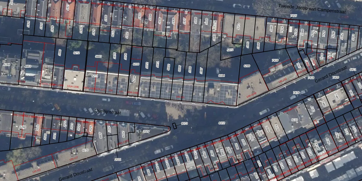 Het adres is gelegen op perceel 6595 in de sectie R en de kadastrale gemeente Amsterdam. De kadastrale aanduiding is aldus ASD14-R-6595. Het perceel is kleiner dan gemiddeld in Amsterdam. Het perceel is 193 m² groot, terwijl het gemiddelde ligt op 354,38 m². Het grootste perceel in de kadastrale gemeente is 9,9 ha. Het kleinste perceel heeft een oppervlakte van 0 m². Op het perceel zijn 8 adressen aanwezig. In de Basisregistratie Kadaster (BRK) werden de grenzen van het perceel geregistreerd op 10-11-2006.