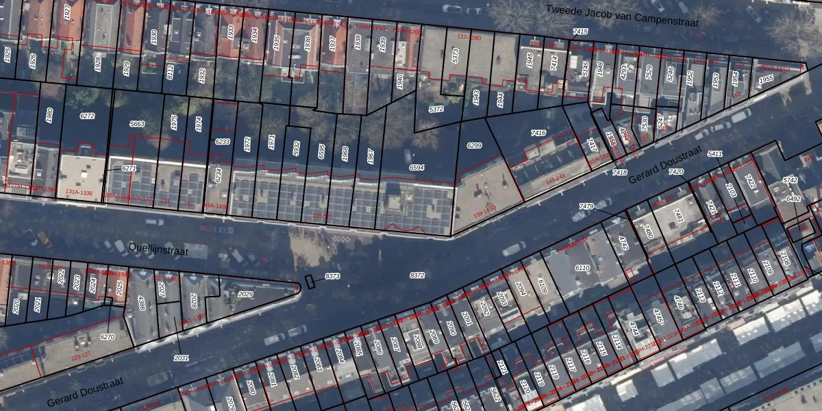 Het perceel waarop Quellijnstraat 159-K staat heeft een oppervlakte van 516 m². Dit is een groot perceel. De perceeloppervlakte wordt geregistreerd door het Kadaster. Gedetailleerde informatie over de maten van dit perceel kunt u vinden in het rapport Kadastrale kaart met maatvoering van Quellijnstraat 159-K.