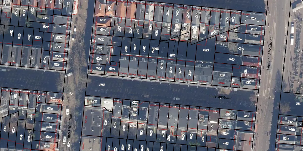 Het perceel waarop Quellijnstraat 43-B staat heeft een oppervlakte van 162 m². Dit is een middelgroot perceel. De perceeloppervlakte wordt geregistreerd door het Kadaster. Gedetailleerde informatie over de maten van dit perceel kunt u vinden in het rapport Kadastrale kaart met maatvoering van Quellijnstraat 43-B.