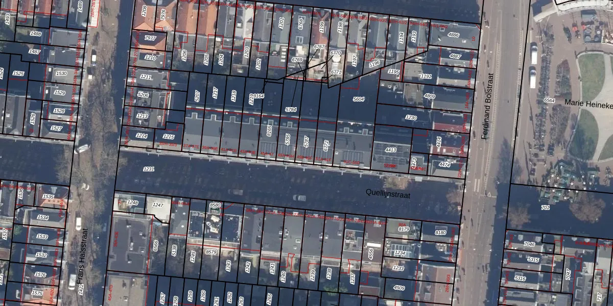 Het perceel waarop Quellijnstraat 49-D staat heeft een oppervlakte van 164 m². Dit is een middelgroot perceel. De perceeloppervlakte wordt geregistreerd door het Kadaster. Gedetailleerde informatie over de maten van dit perceel kunt u vinden in het rapport Kadastrale kaart met maatvoering van Quellijnstraat 49-D.
