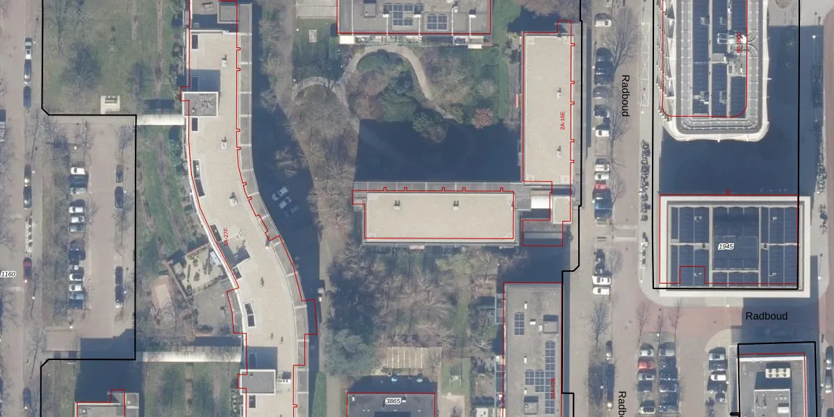 Het perceel waarop Radboud 12-B staat heeft een oppervlakte van 1,7 ha. Dit is een zeer groot perceel. De perceeloppervlakte wordt geregistreerd door het Kadaster. Gedetailleerde informatie over de maten van dit perceel kunt u vinden in het rapport Kadastrale kaart met maatvoering van Radboud 12-B.