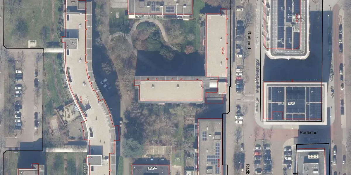 Het perceel waarop Radboud 14-C staat heeft een oppervlakte van 1,7 ha. Dit is een zeer groot perceel. De perceeloppervlakte wordt geregistreerd door het Kadaster. Gedetailleerde informatie over de maten van dit perceel kunt u vinden in het rapport Kadastrale kaart met maatvoering van Radboud 14-C.