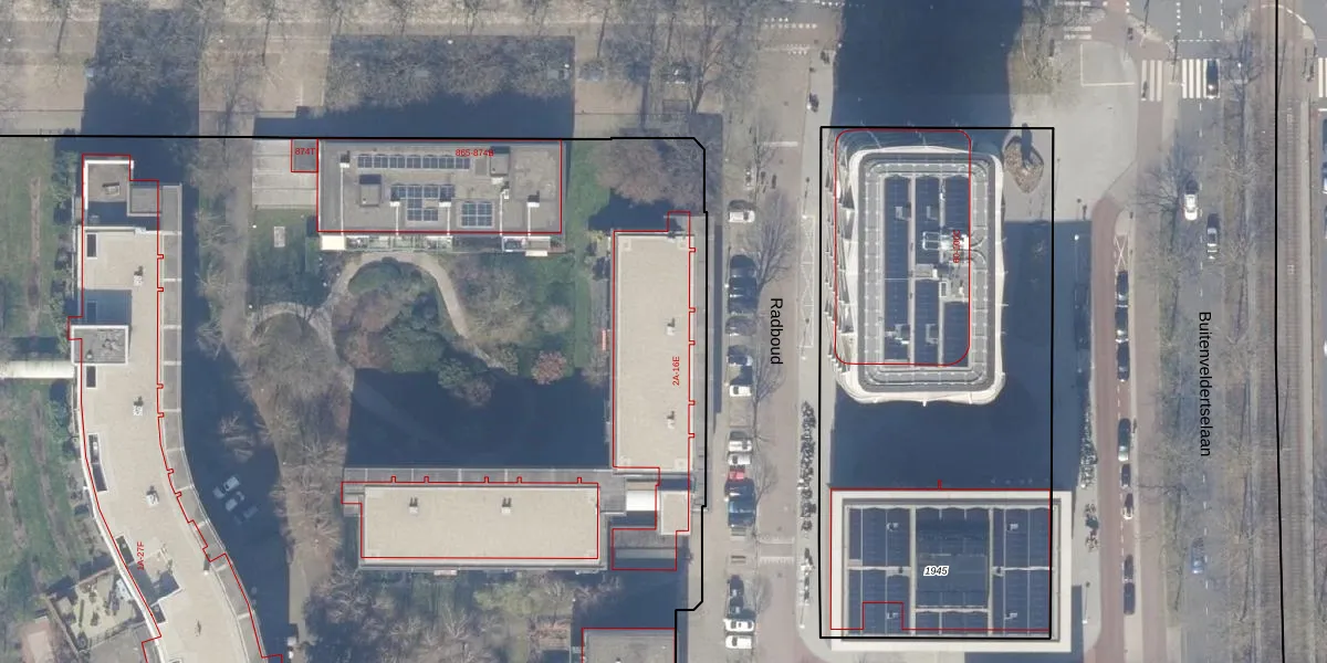 Het perceel waarop Radboud 6-B staat heeft een oppervlakte van 1,7 ha. Dit is een zeer groot perceel. De perceeloppervlakte wordt geregistreerd door het Kadaster. Gedetailleerde informatie over de maten van dit perceel kunt u vinden in het rapport Kadastrale kaart met maatvoering van Radboud 6-B.