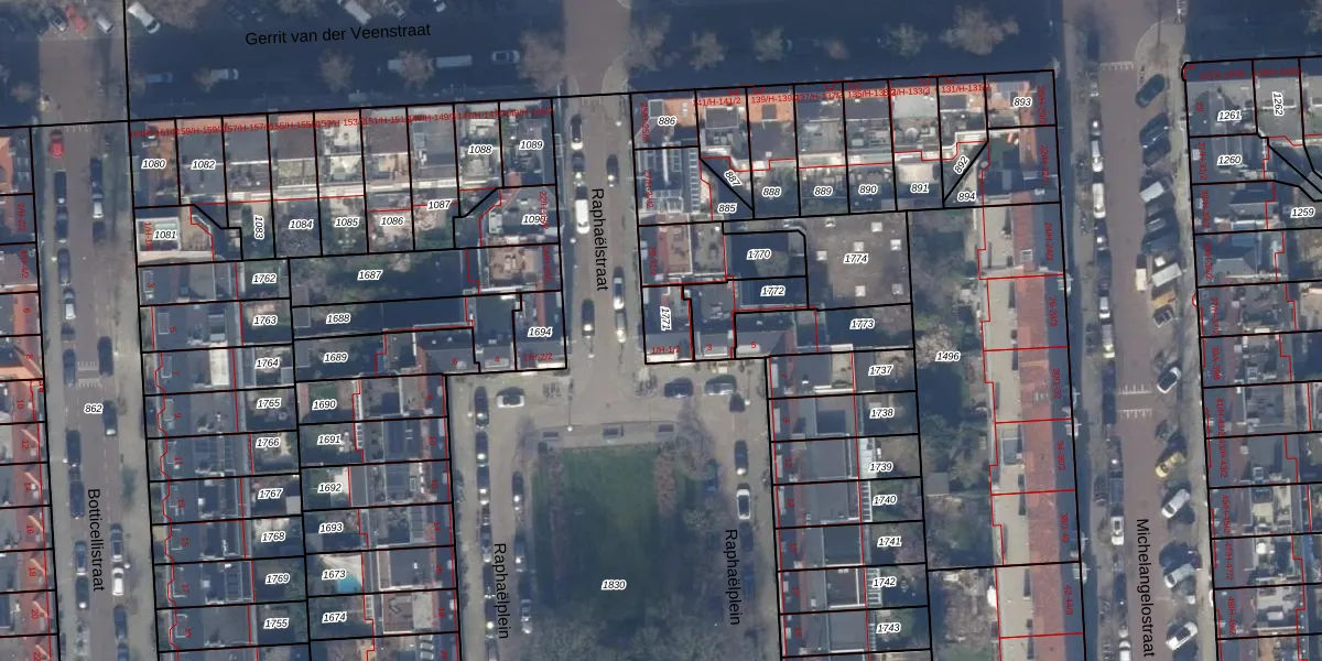 Het perceel waarop Raphaëlplein 1-H staat heeft een oppervlakte van 84 m². Dit is een klein perceel. De perceeloppervlakte wordt geregistreerd door het Kadaster. Gedetailleerde informatie over de maten van dit perceel kunt u vinden in het rapport Kadastrale kaart met maatvoering van Raphaëlplein 1-H.