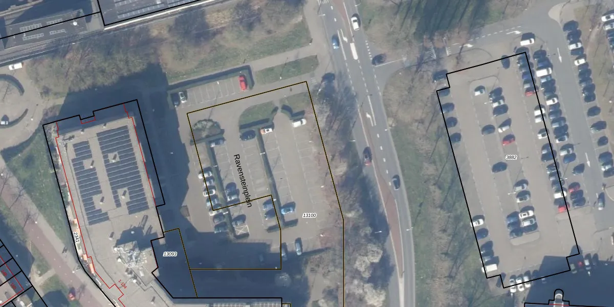 Het perceel waarop Ravensteinplein 13 staat heeft een oppervlakte van 2634 m². Dit is een zeer groot perceel. De perceeloppervlakte wordt geregistreerd door het Kadaster. Gedetailleerde informatie over de maten van dit perceel kunt u vinden in het rapport Kadastrale kaart met maatvoering van Ravensteinplein 13.