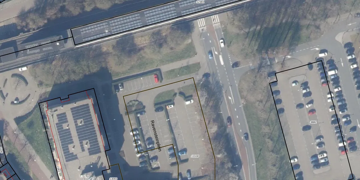Het perceel waarop Ravensteinplein 44 staat heeft een oppervlakte van 2634 m². Dit is een zeer groot perceel. De perceeloppervlakte wordt geregistreerd door het Kadaster. Gedetailleerde informatie over de maten van dit perceel kunt u vinden in het rapport Kadastrale kaart met maatvoering van Ravensteinplein 44.