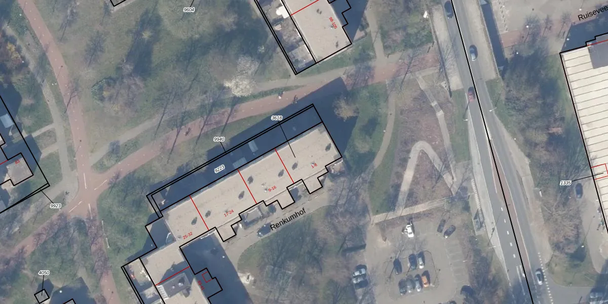 Renkumhof 1 is gelegen op kadastraal perceel WPK02L3618. Deze kadastrale aanduiding is uniek en wordt gebruikt door het Kadaster om eigendomsrechten en andere zakelijke rechten vast te leggen. Het perceel maakt onderdeel uit van de kadastrale gemeente Weesperkarspel.