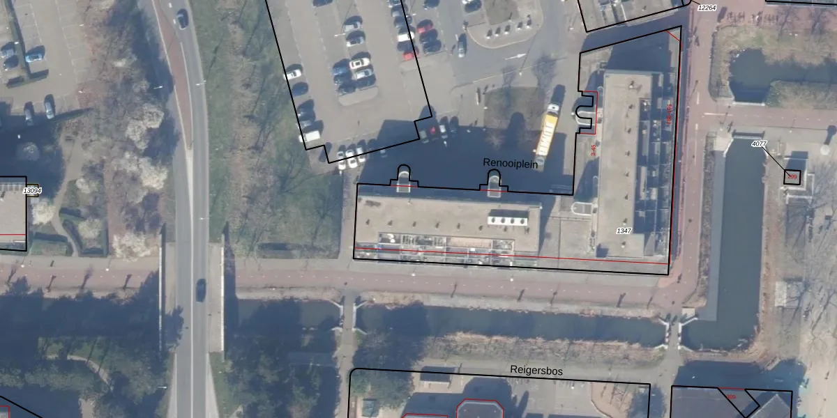 Het perceel waarop Renooiplein 10 staat heeft een oppervlakte van 2303 m². Dit is een zeer groot perceel. De perceeloppervlakte wordt geregistreerd door het Kadaster. Gedetailleerde informatie over de maten van dit perceel kunt u vinden in het rapport Kadastrale kaart met maatvoering van Renooiplein 10.