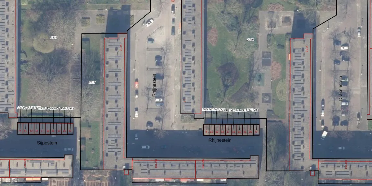 Rhijnestein 1 is gelegen op kadastraal perceel ASD30AK2318. Deze kadastrale aanduiding is uniek en wordt gebruikt door het Kadaster om eigendomsrechten en andere zakelijke rechten vast te leggen. Het perceel maakt onderdeel uit van de kadastrale gemeente Amsterdam.