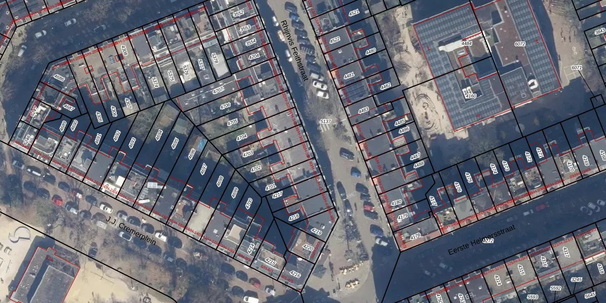 Het perceel waarop het adres ligt is ASD16-T-4702. De afkorting 'ASD16' staat voor kadastrale gemeente Amsterdam. Het perceel is 147 m² groot. Dat is kleiner dan de gemiddelde perceeloppervlakte in Amsterdam, dat op 245,33 m² ligt. Het kleinste perceel in de kadastrale gemeente is 0 m² groot. De grootste perceeloppervlakte is 3,3 ha. Op het perceel liggen in totaal 4 adressen. In de Basisregistratie Kadaster (BRK) werden de grenzen van het perceel geregistreerd op 10-01-2007.