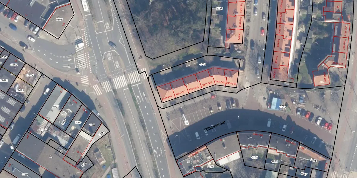 Ribesstraat 42-H is gelegen op kadastraal perceel ASD07K5735. Deze kadastrale aanduiding is uniek en wordt gebruikt door het Kadaster om eigendomsrechten en andere zakelijke rechten vast te leggen. Het perceel maakt onderdeel uit van de kadastrale gemeente Amsterdam.