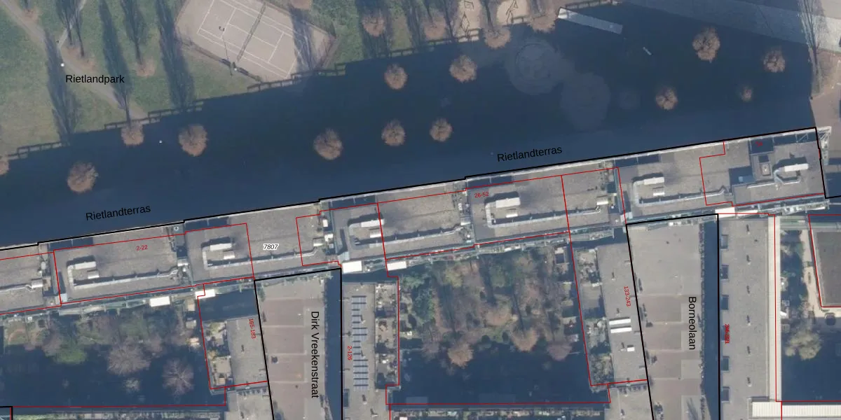 Rietlandterras 30 is gelegen op kadastraal perceel ASD02A7807. Deze kadastrale aanduiding is uniek en wordt gebruikt door het Kadaster om eigendomsrechten en andere zakelijke rechten vast te leggen. Het perceel maakt onderdeel uit van de kadastrale gemeente Amsterdam.