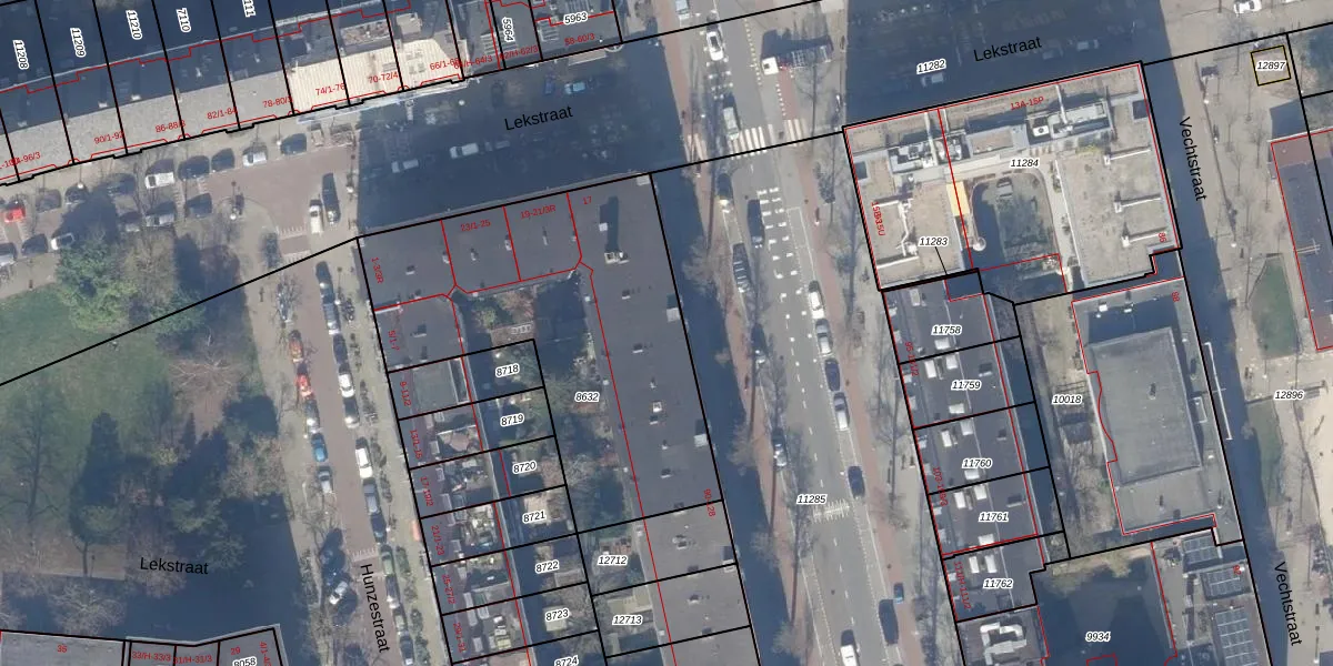 Het perceel waarop het adres ligt is ASD18-V-8632. De afkorting 'ASD18' staat voor kadastrale gemeente Amsterdam. De gemiddelde perceeloppervlakte in de kadastrale gemeente Amsterdam is 558,8 m². Dit perceel is met zijn 1596 m² dus groter dan gemiddeld. Het grootste perceel in de kadastrale gemeente is 12,5 ha. Het kleinste perceel heeft een oppervlakte van 0 m². Er zijn 45 adressen aanwezig op het perceel. De laatste wijziging in het de Basisregistratie Kadaster (BRK) was op 22-11-2006.