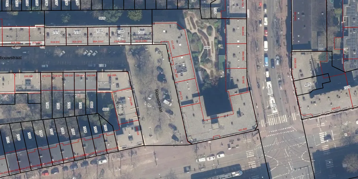 Het perceel waarop Riouwstraat 169 staat heeft een oppervlakte van 3070 m². Dit is een zeer groot perceel. De perceeloppervlakte wordt geregistreerd door het Kadaster. Gedetailleerde informatie over de maten van dit perceel kunt u vinden in het rapport Kadastrale kaart met maatvoering van Riouwstraat 169.