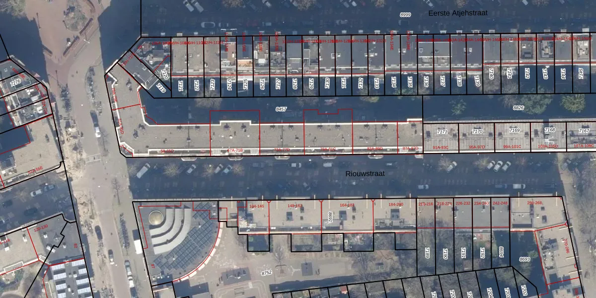 Riouwstraat 77-D is gelegen op kadastraal perceel ASD15S8457. Deze kadastrale aanduiding is uniek en wordt gebruikt door het Kadaster om eigendomsrechten en andere zakelijke rechten vast te leggen. Het perceel maakt onderdeel uit van de kadastrale gemeente Amsterdam.