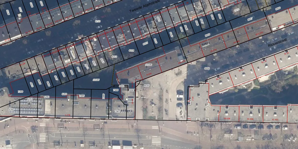 Riouwstraat 9 is gelegen op kadastraal perceel ASD15S10186. Deze kadastrale aanduiding is uniek en wordt gebruikt door het Kadaster om eigendomsrechten en andere zakelijke rechten vast te leggen. Het perceel maakt onderdeel uit van de kadastrale gemeente Amsterdam.