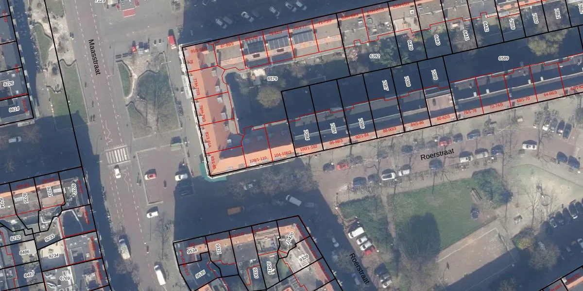 Roerstraat 104 is gelegen op kadastraal perceel ASD18V6579. Deze kadastrale aanduiding is uniek en wordt gebruikt door het Kadaster om eigendomsrechten en andere zakelijke rechten vast te leggen. Het perceel maakt onderdeel uit van de kadastrale gemeente Amsterdam.