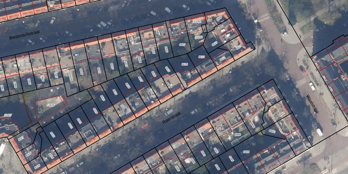 Het perceel waarop het adres ligt is ASD18-V-6615. De afkorting 'ASD18' staat voor kadastrale gemeente Amsterdam. Het perceel is 173 m² groot. Dat is kleiner dan de gemiddelde perceeloppervlakte in Amsterdam, dat op 559,23 m² ligt. Het grootste perceel in de kadastrale gemeente is 12,5 ha. Het kleinste perceel heeft een oppervlakte van 0 m². Er zijn 5 adressen aanwezig op het perceel. De huidige grenzen van het perceel zijn digitaal in de Basisregistratie Kadaster (BRK) geregistreerd op 19-11-2019.